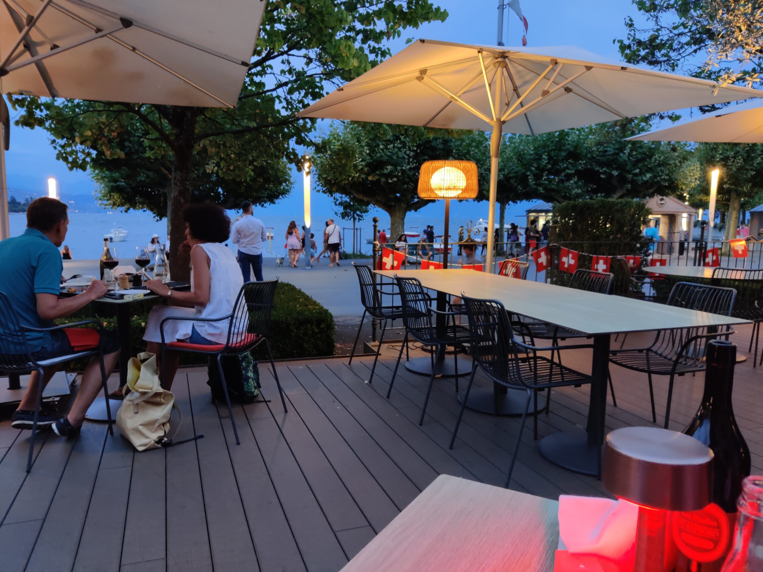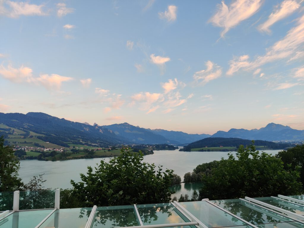 Das Hotel entspricht so gar nicht den Erwartungen an ein Romantikhotel. Direkt neben einer Autowerkstatt und deren Parkplatz steht an einer belebten Landstrasse ein Zweckbau mit einigen Zimmern und einer Restauration – aber mit einem herrlichen Blick über den Greyerzersee.