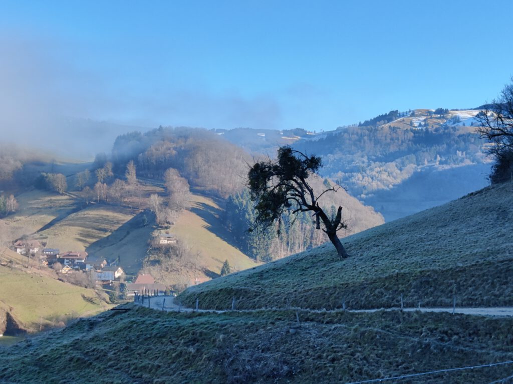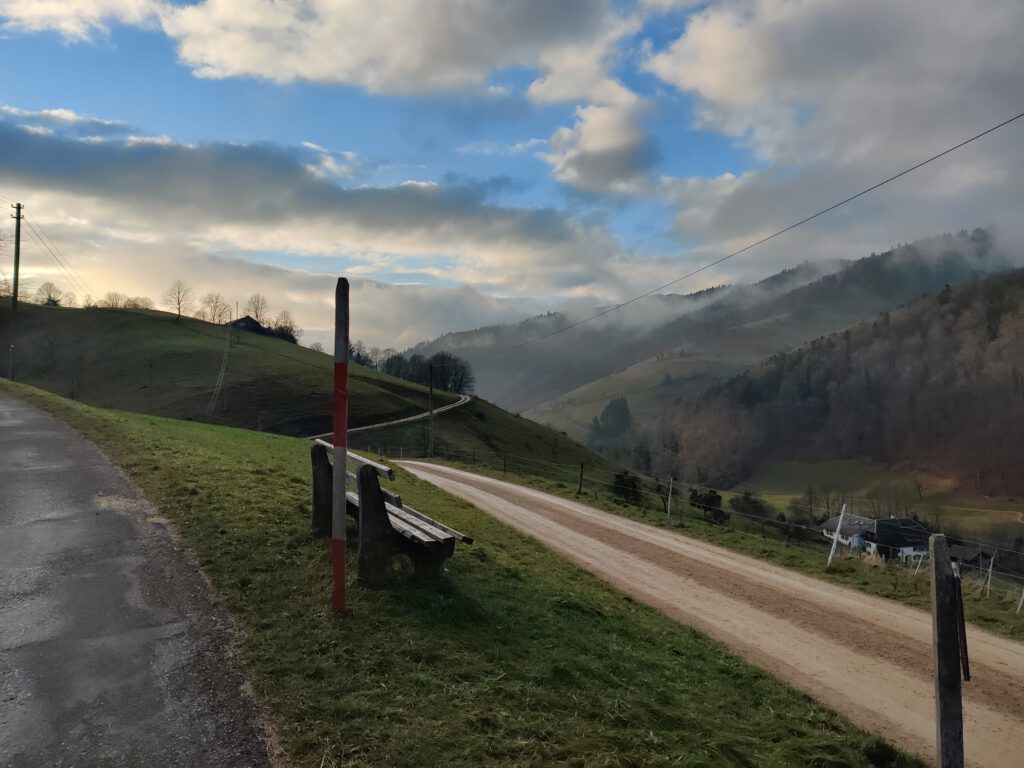 Aber immerhin lässt es das Wetter (kein Regen, häufig Nebel, ab und zu schaut die Sonne heraus) zu, jeden Tag eine knappe Stunde durchs Tal und im unteren Bereich des Brandten zu gehen und durch die zu bewältigenden Höhenmeter ein bisschen an der Fitness zuarbeiten.