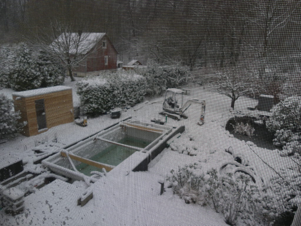Am nächsten Morgen hat der Schnee auch Wennigsen erreicht, sodass der Baufortschritt am Pool nur in Teilen zu erkennen ist.