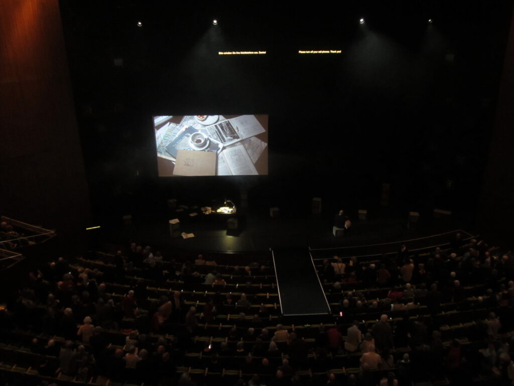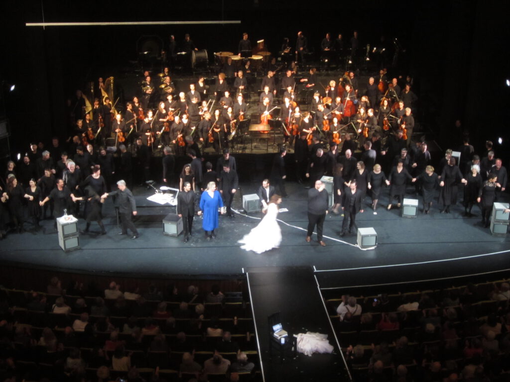 Uns erwartet eine ungewöhnliche Inszenierung. Das Orchester nicht im Graben sondern hinter einem Gazevorhang im Hintergrund der Bühne, die Chöre verteilt auf die einzelnen Ränge und auch unter dem Publikum im Parkett einzelne Chormitglieder und hinter uns im 2. Rang ein Teil der Blechbläser.
