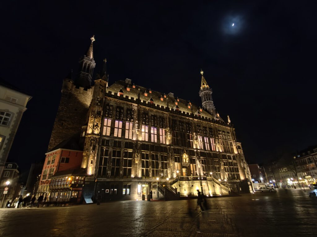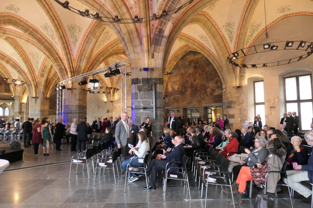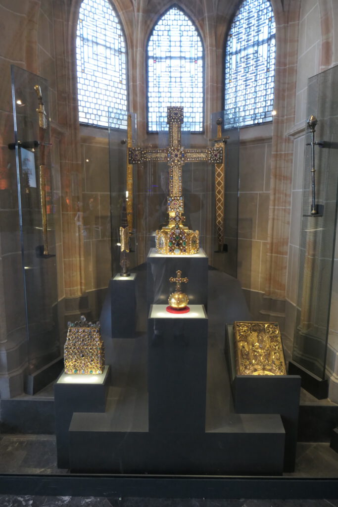 Im beeindruckenden Kaisersaal des Rathauses (in Kürze wird hier auch wieder der jährliche Karlspreis verliehen, diesmal an den ukrainischen Präsidenten Selenski) und die Reichsinsignien (Kopien) im Blick …