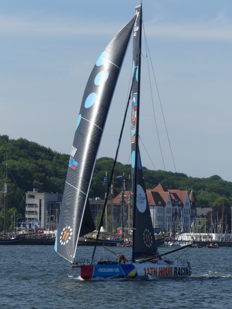 Wirklich im Nachhinein ein Once-in-a-Lifetime-Erlebnis. Die Formel 1 der Hochseesegelboote hatte von Aarhus kommend schon jeweils 20 bis 30 Minuten Abstand zwischen sich aufgebaut, sodass jedes Boot die Bühne in der Innenförde vor ca. 30.000 Zuschauern und einer Menge von Beobachtungsbooten auf dem Wasser für sich alleine hatte. Als erstes erschien die Jacht „11 Hours Racing“ …