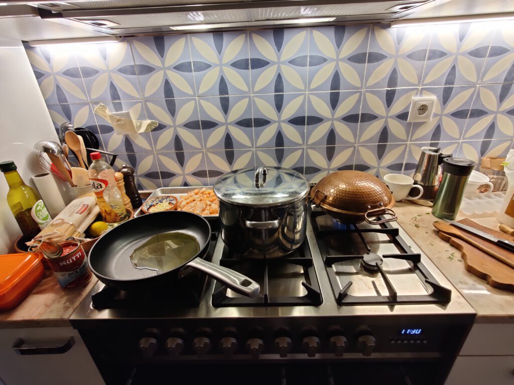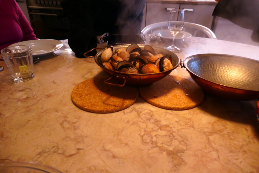 Später nach einem Aperitif auf dem Balkon bereiten Ingo und ich das Abendessen vor. Es gibt Muschel in einem Weißweinsud aus der Cataplana als Vorspeise von Ingo zubereitet und ich mache Nudeln mit reichlich Shrimps in einer Tomaten-Knoblauchsauce, wobei ich den Rest des würzigen Suds vom letzten Muschelessen verwende.