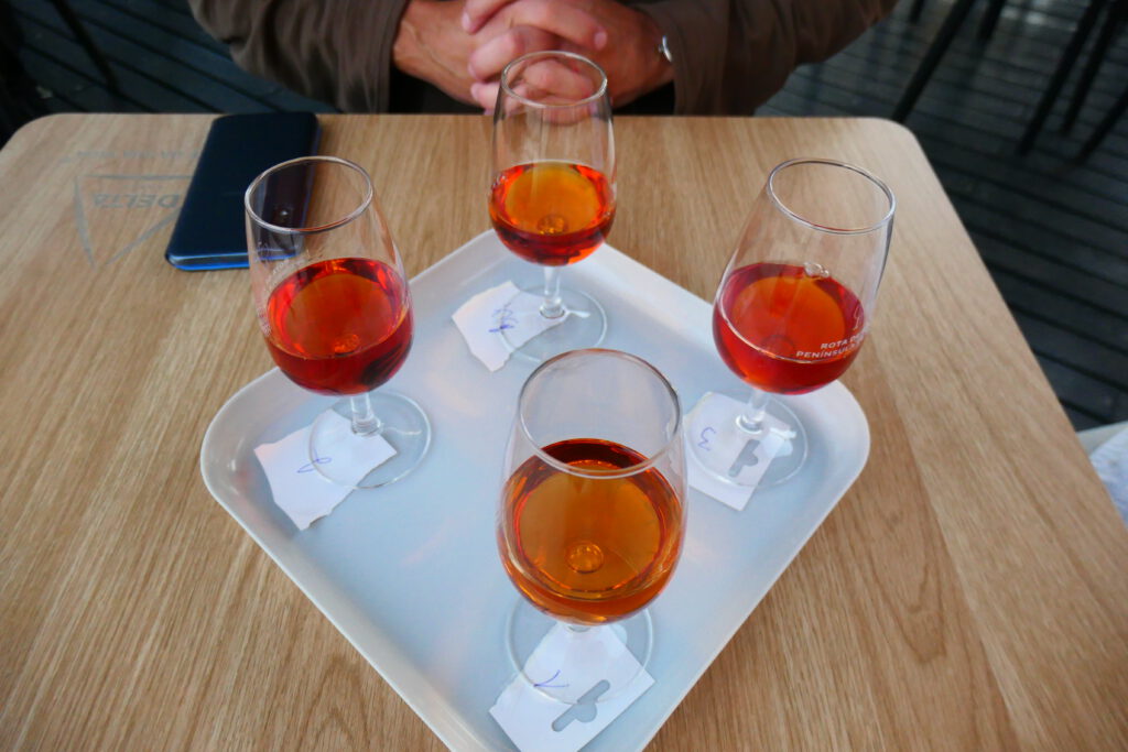 Eine Spezialität der Region ist der Moscatel (ein an Port oder Sherry erinnernder Muskateller), den wir bei untergehender Sonne auf der Terrasse in unterschiedlichen Varianten probieren.