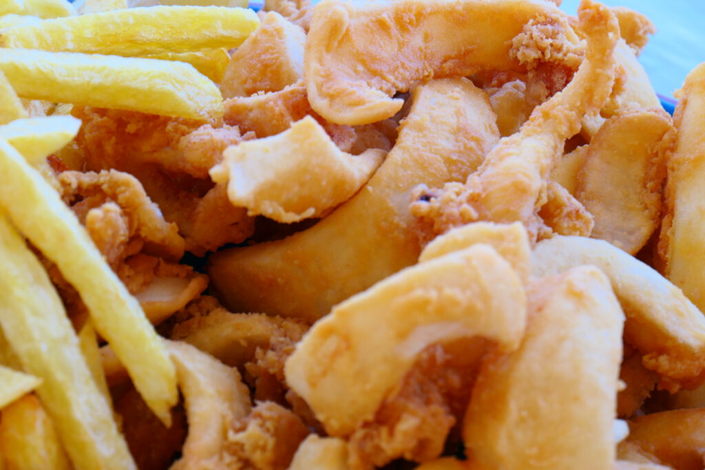 … gibt es eine große Portion fritierten Tintenfisch mit Pommes und eine gut gekühlte Flasche Weißwein.