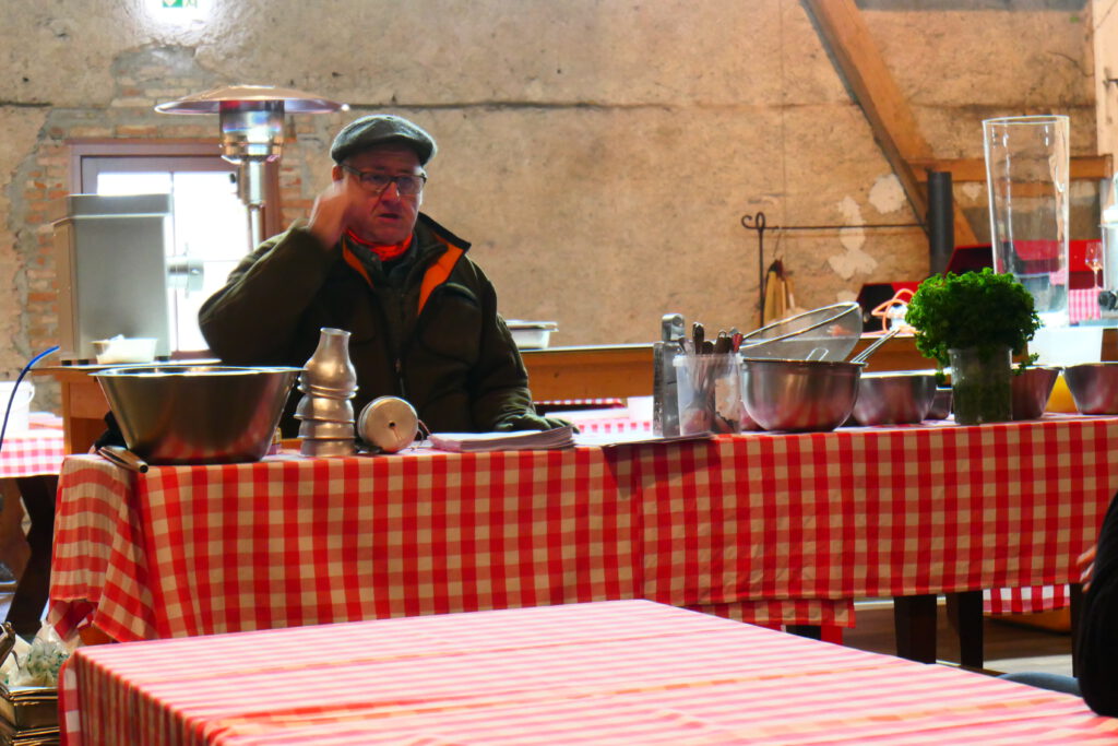 Zum Abschluss frische Weißwurst aus dem Kessel mit Brezel und süßem Senf (leider kein Foto), begleitet von einem Kirschwasser. Pünktlich zum Start des Abendessens im Restaurant waren wir fertig. Jeder der Teilnehmer erhält zum Abschluss einen Korb mit einem Teil der produzierten Köstlichkeiten. Mein Anteil wird bis zu unserer Abfahrt am nächsten Sonntag sicher in der Kühlung aufbewahrt.