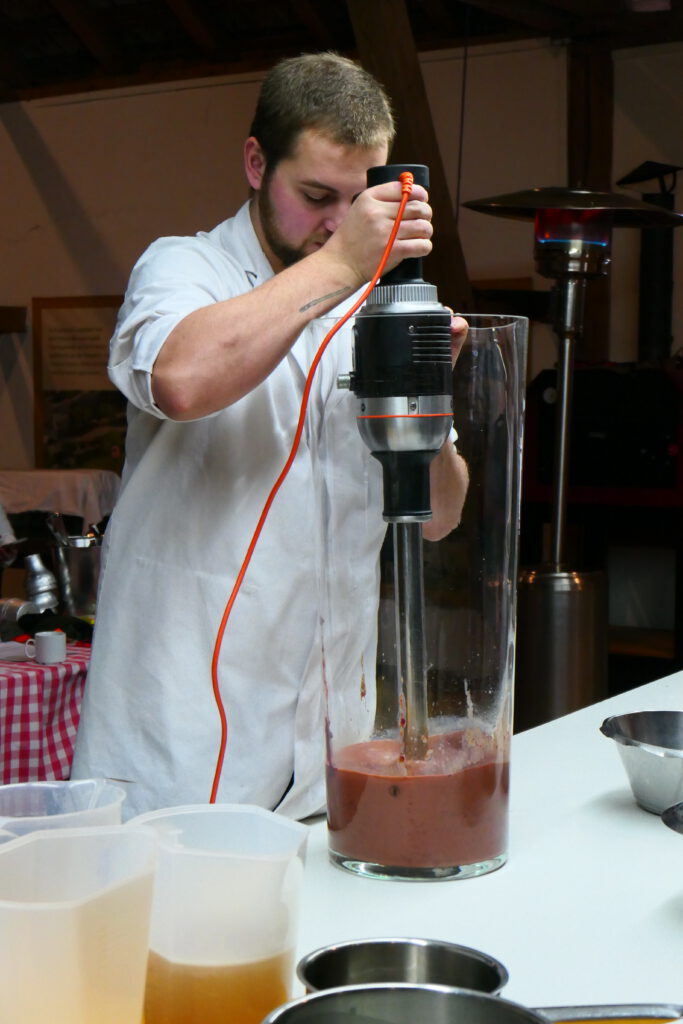 Unter tätiger Mithilfe eines gelernten Metzgers wird geschnippelt, gerührt, gewolft, in Därme abgefüllt und gemixt. Hier die Grundlage für das Sahne-Wildleber-Parfait (übrigens in einer Ikea-Blumenvase).