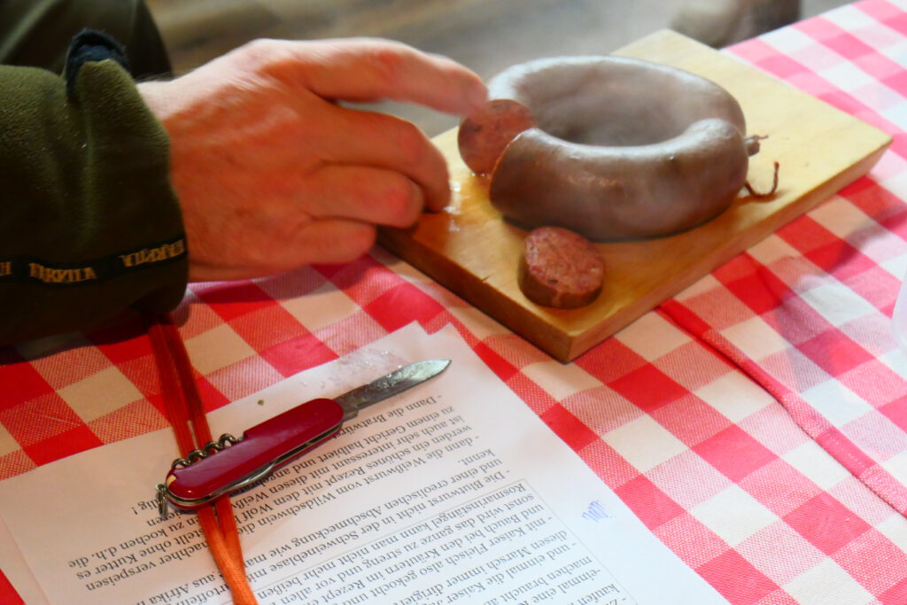 Zwischendurch wird probiert. Am leckersten die Wildkrakauer frisch aus dem Räucherofen.