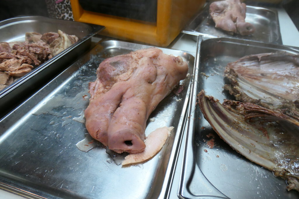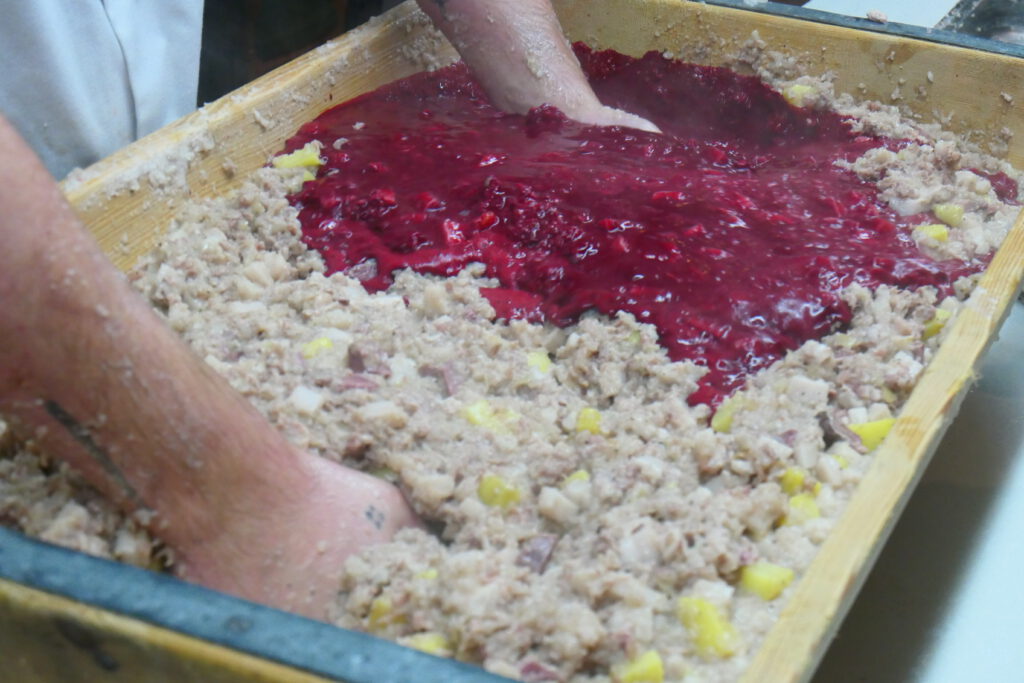 Natürlich werden nicht nur die unedlen Teile vom Wild, wie Rippenfleisch, Bauchlappen oder Haxen, sondern auch als Beigabe Schweine- und Rindfleisch, wie hier für die Wildblutwurst halbe Schweinsköpfe, verarbeitet.