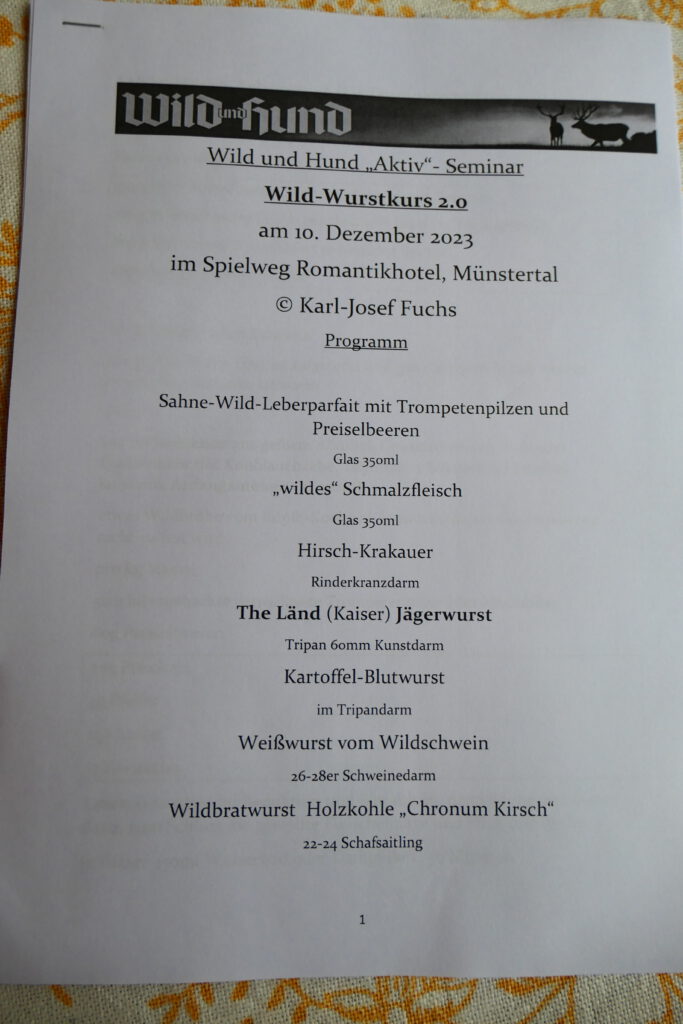 Die Anreise am Samstag schon deswegen, da mir Gesine zu meinem Geburtstag die Teilnahme an dem Wild-Wurst-Kurs 2.0 vom „alten“ Fuchs geschenkt hat. Dieser Kurs startet nun am Sonntag, dem 10.12. um 12.00 Uhr.